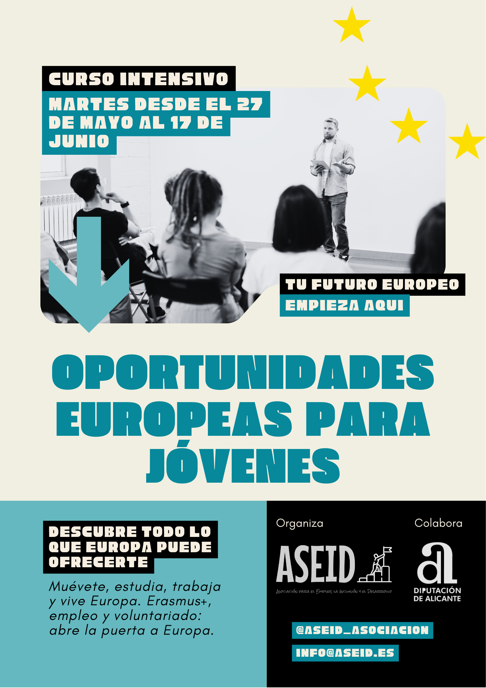 ASEID organizará el curso Oportunidades Europeas para Jóvenes 2025, una iniciativa gratuita financiada por la Diputación de Alicante, dirigida a acercar a la juventud de la comarca todas las posibilidades que ofrece la Unión Europea en materia de movilidad, formación, empleo y participación activa. El programa se desarrollará en cuatro jornadas de tarde (27 de…